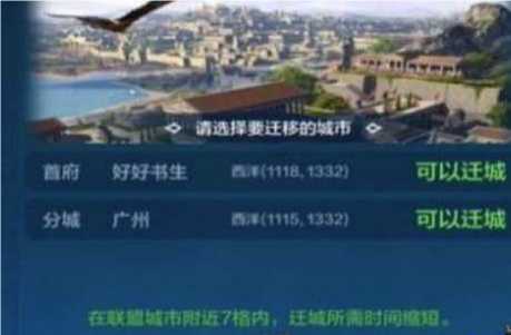 3、游戲到了發(fā)展后期,很多玩家會選擇將主城遷移至聯(lián)盟城市以便于資源的使用與進(jìn)一步發(fā)展,玩家們可以根據(jù)自己的需要來選擇主城位置。