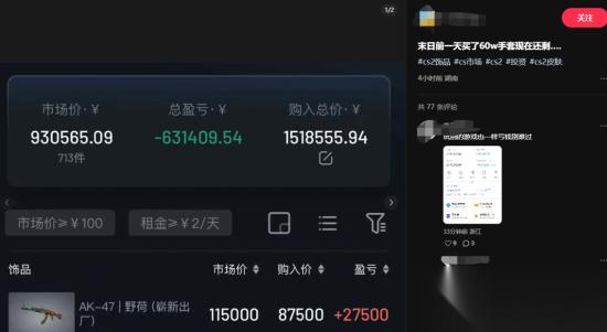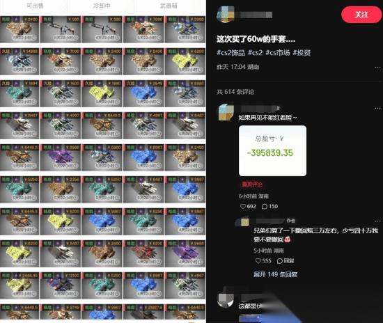 而對于“飾品商人”來說,這次更新堪稱滅頂之災(zāi)。有小紅書玩家曬出截圖稱,自己在更新前花費約60萬元人民幣購入手套飾品,如今已虧損超過60萬元。