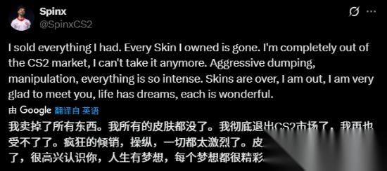 mousesports戰(zhàn)隊選手Spinx則寫道:“我賣掉了所有東西,我退出CS2市場。瘋狂的拋售、操縱,一切都太夸張了。皮膚時代結(jié)束了。再見,CS2。人生有夢想,但這個夢該醒了?!?/p>
